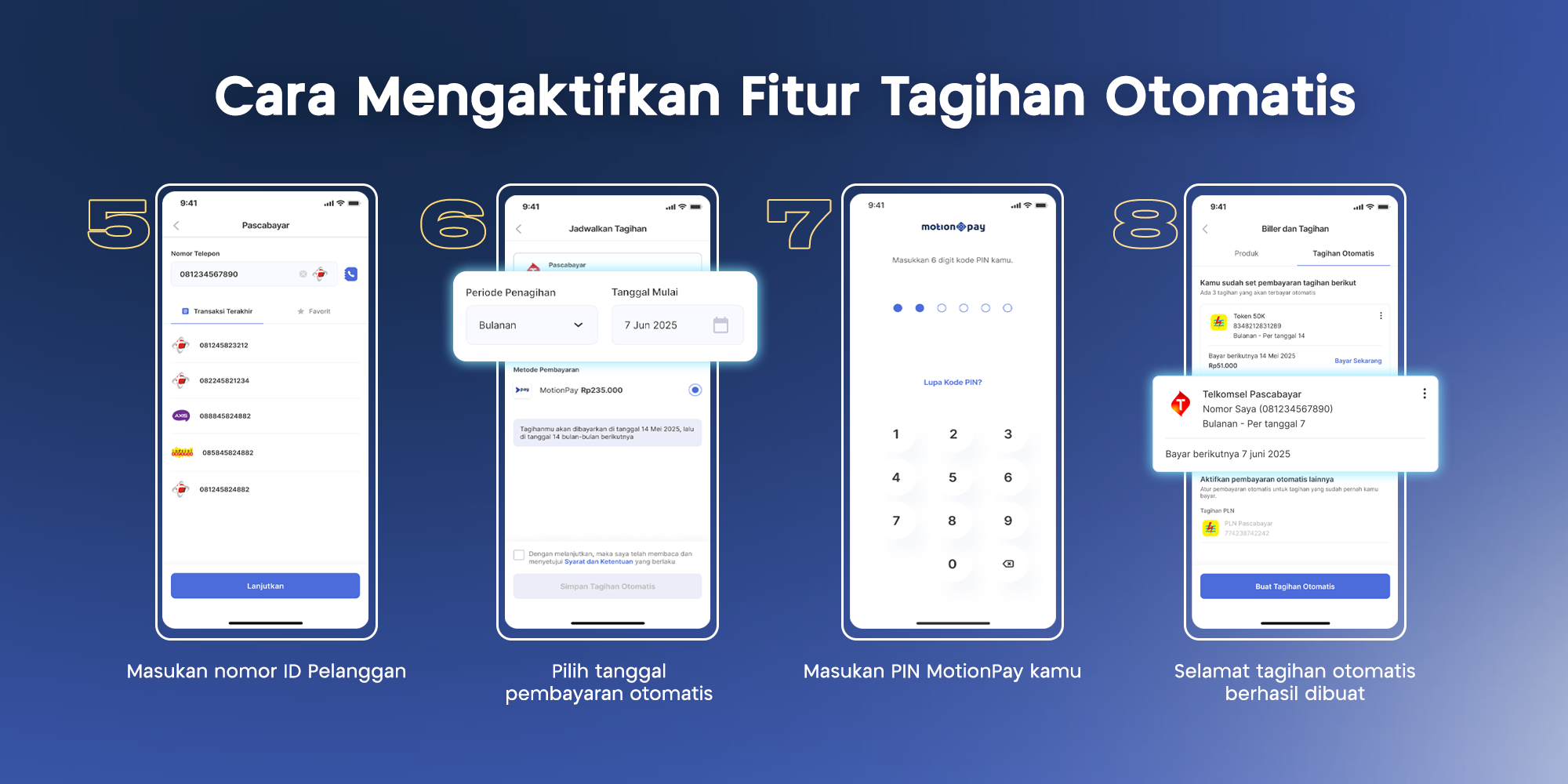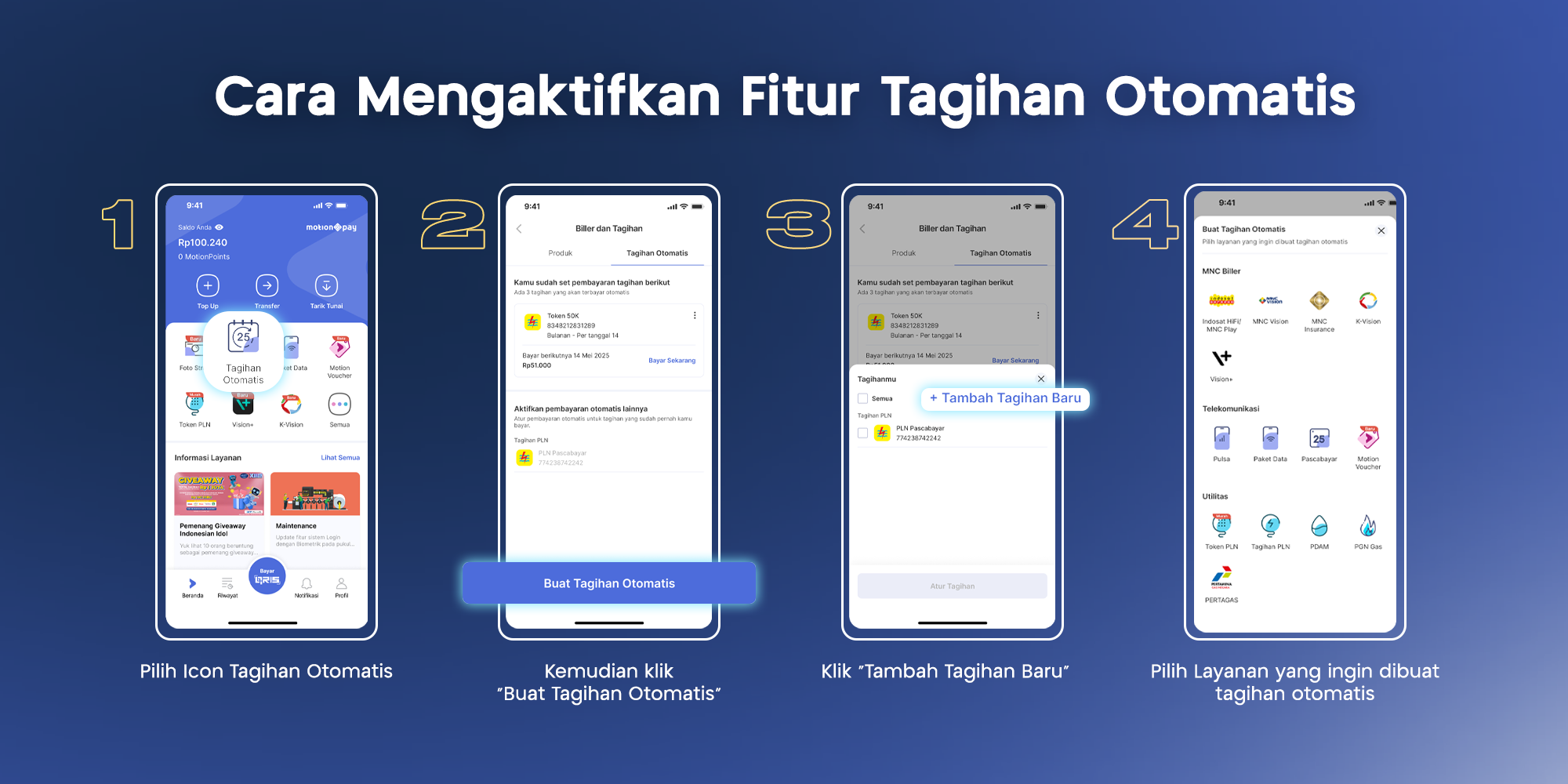 Tidak perlu khawatir lagi, karena kini telah hadir fitur Tagihan Otomatis di MotionPay! Anda dapat langsung berlangganan pembayaran tagihan bulanan yang akan dibayarkan secara otomatis dari saldo MotionPay Anda. Mari simak cara mengaktifkan fitur Tagihan Otomatis berikut ini!